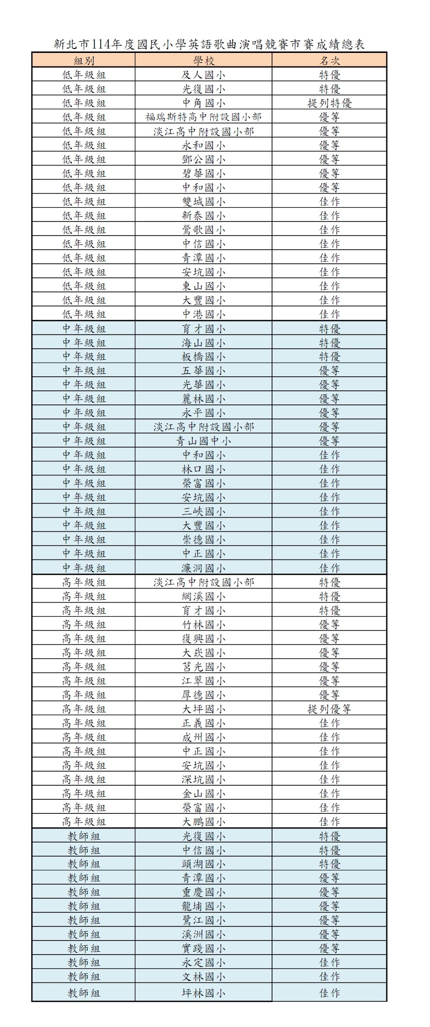 壹、114年度英語歌唱比賽市賽成績公告